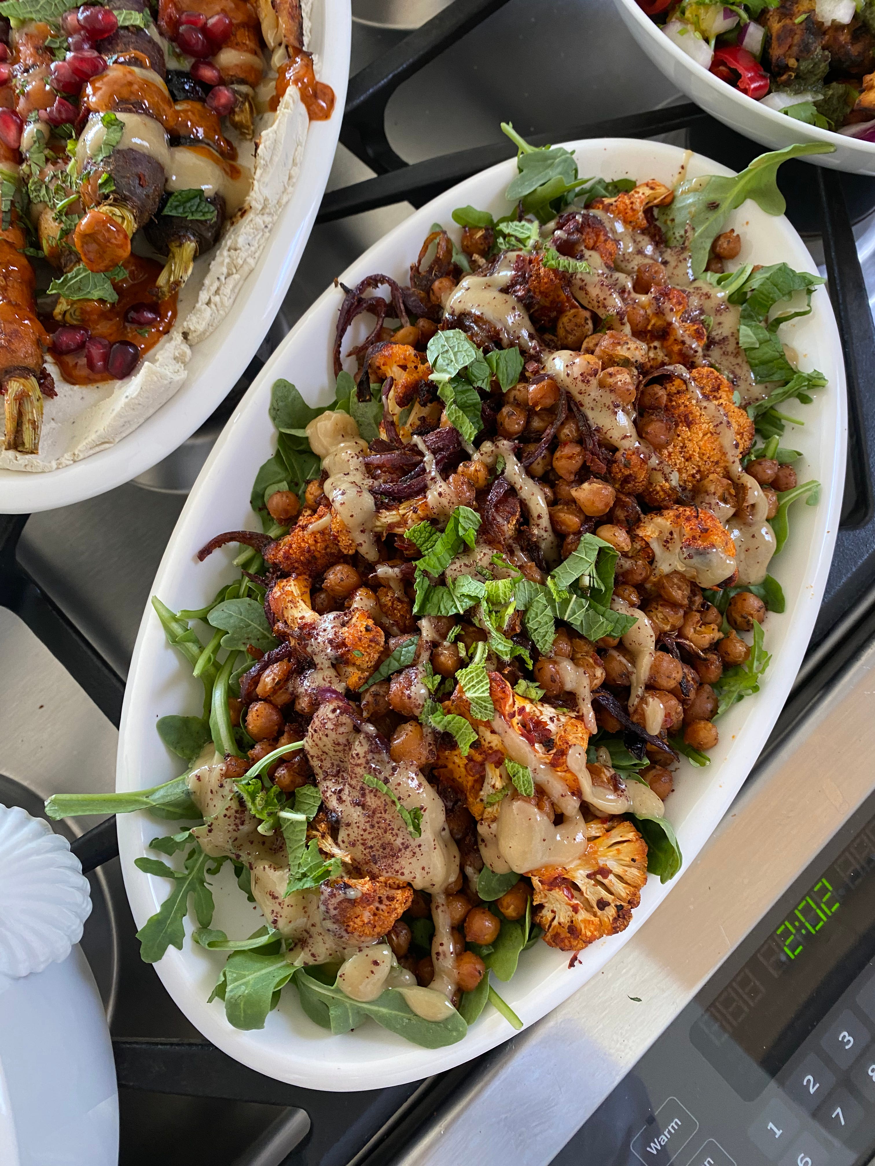 Cauliflower and chickpeas served over fresh arugula with lemon tahini honey drizzle, sumac, and mint leaves