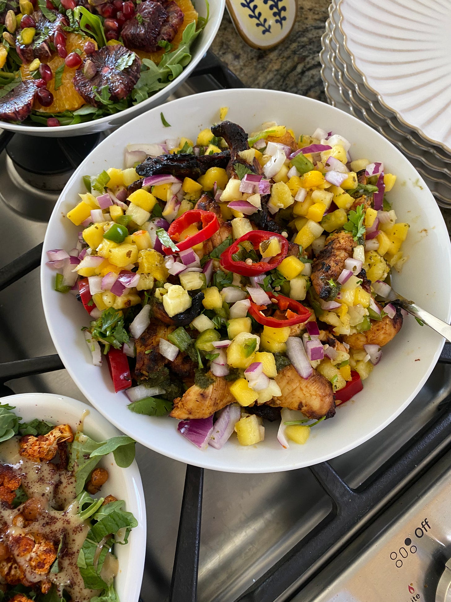 Chicken topped with mango salsa, cilantro and Fresno peppers