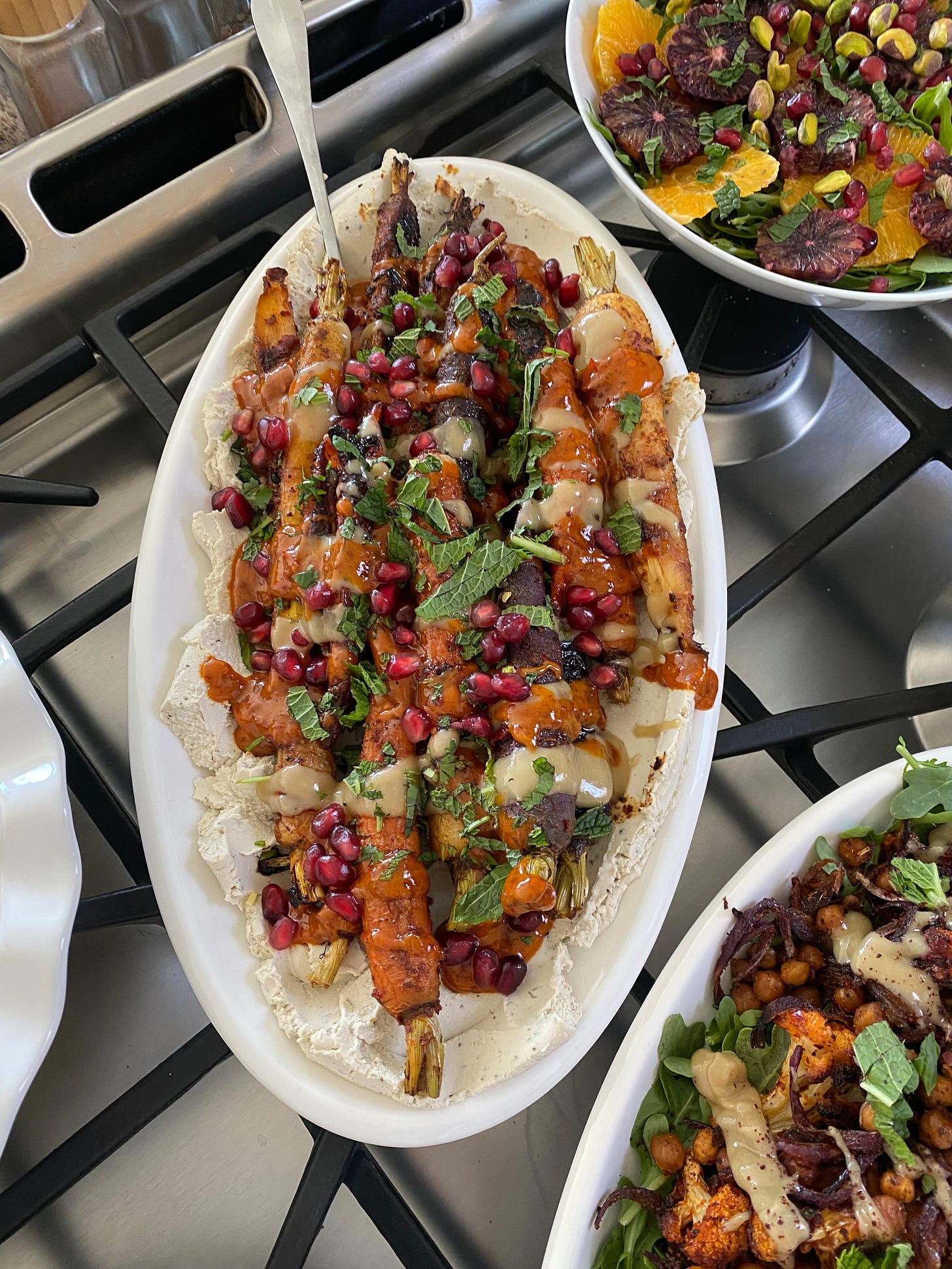Rainbow carrots arranged by color with the dual tahini drizzles, pomegranate seeds, and mint leaves