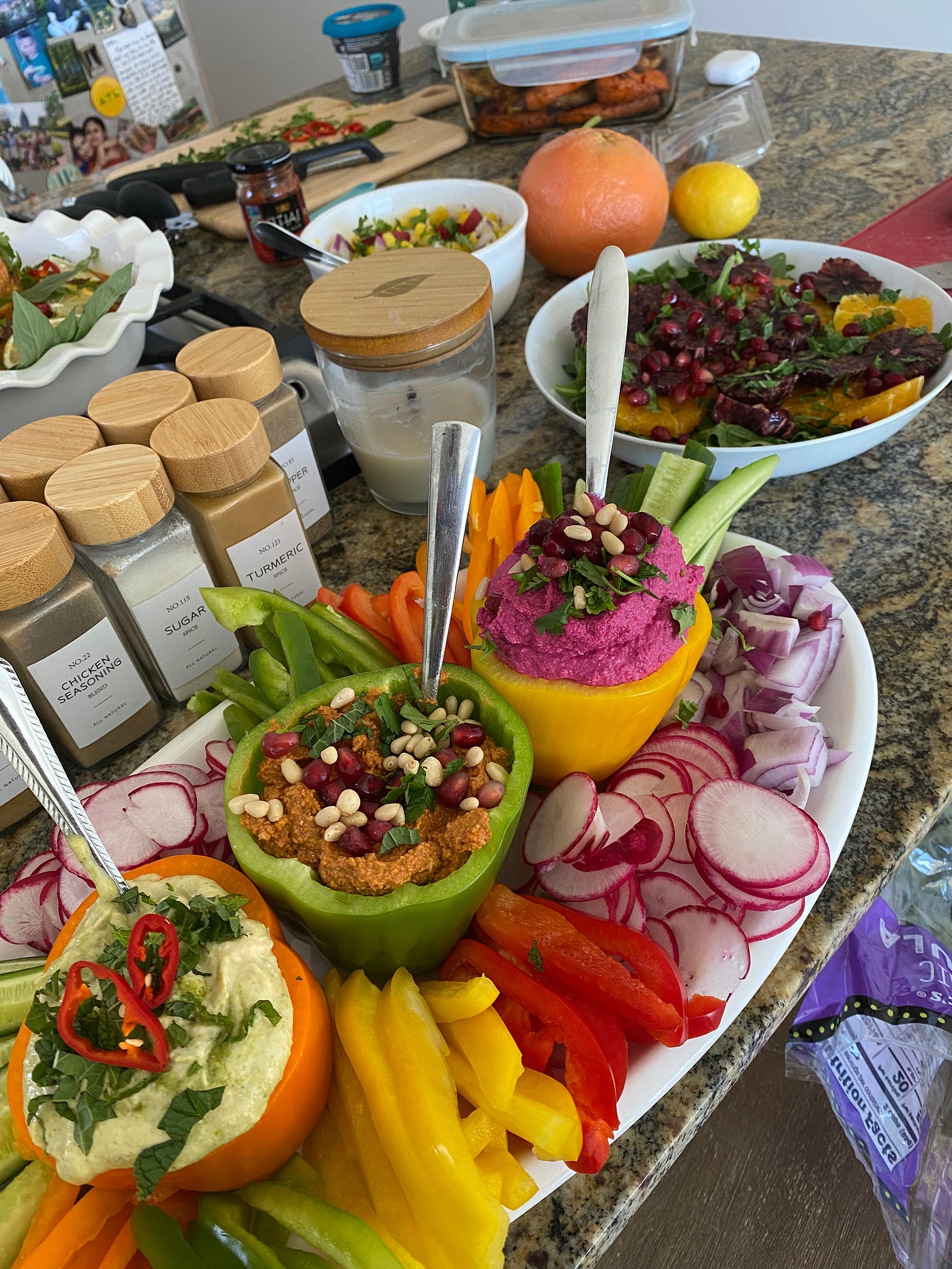 Sometimes store-bought is the smartest choice! I picked up beet hummus, green hummus (parsley and cilantro), and Muhammara from Whole Foods and served them in hollowed-out bell pepper cups. The veggie selection was comprised of tri-color peppers, quarters of red onion, radishes, and 3-4 sliced cucumbers for dipping.