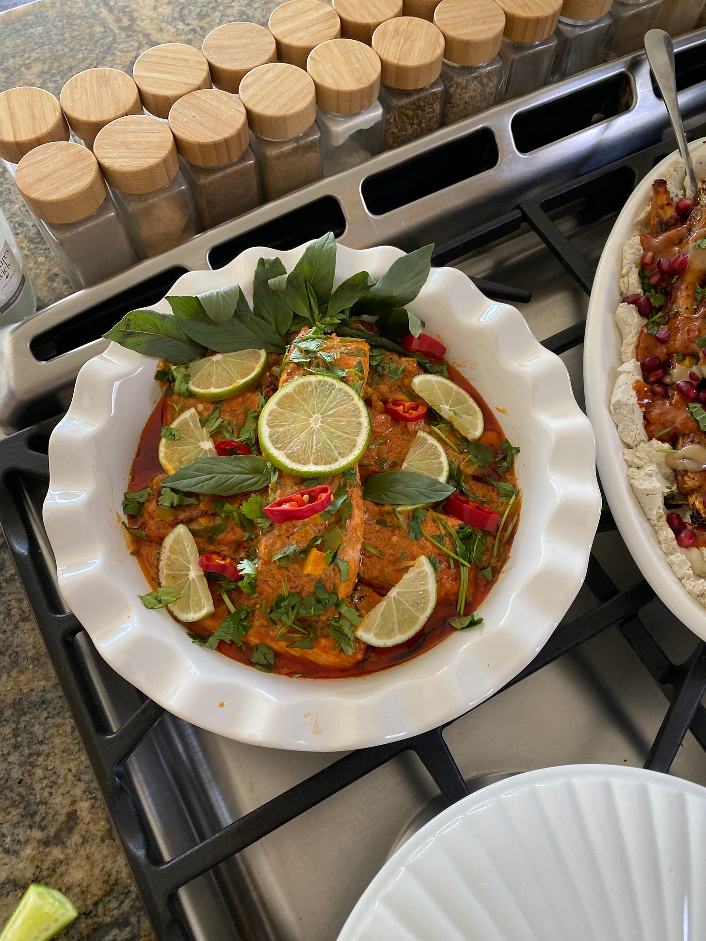 Salmon with its fragrant curry sauce, fresh Thai basil and Fresno peppers