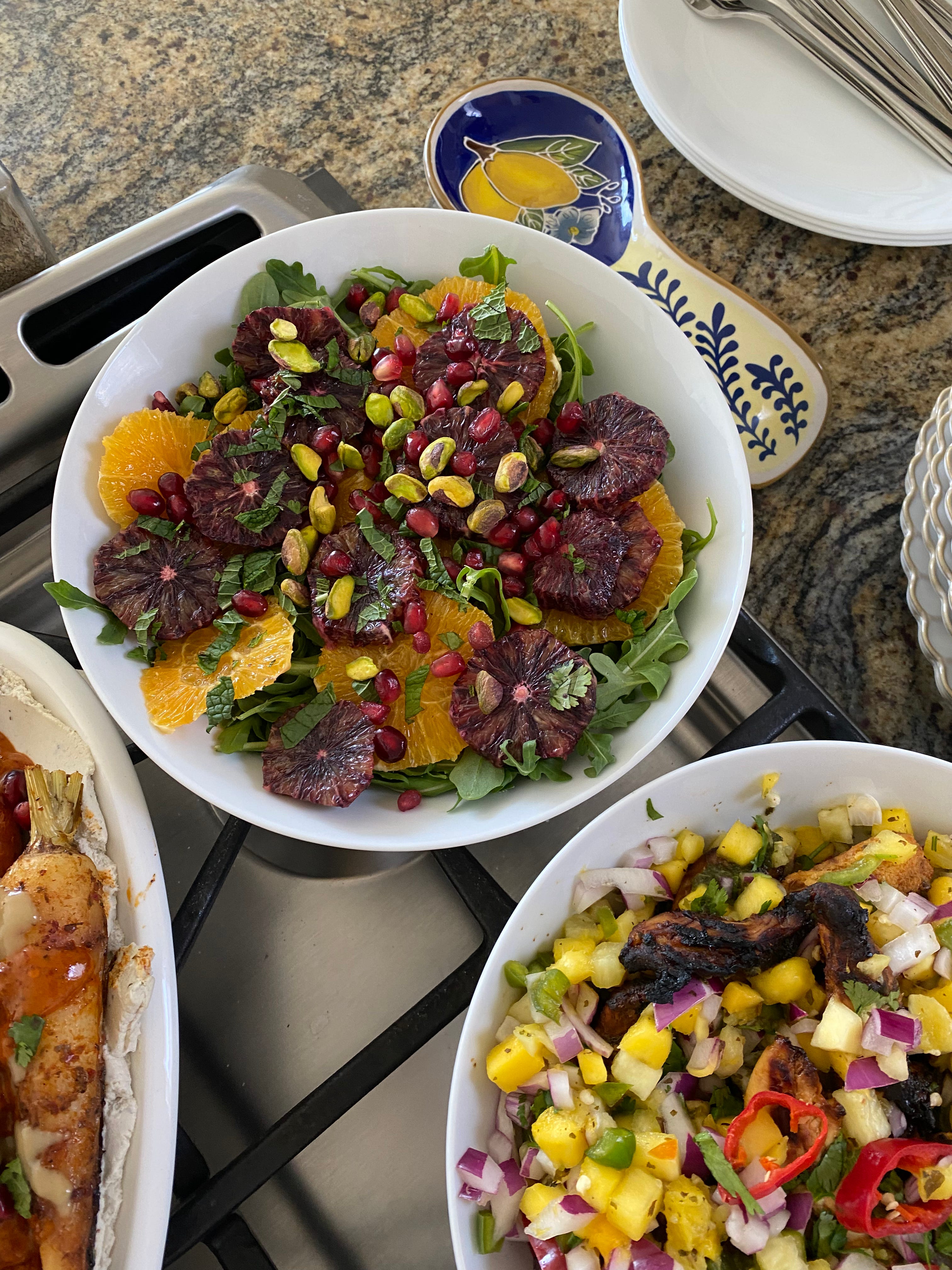 Slice 1 navel orange and 2 blood oranges and place them over arugula, topping it with mint leaves, pomegranate seeds, and pistachios.